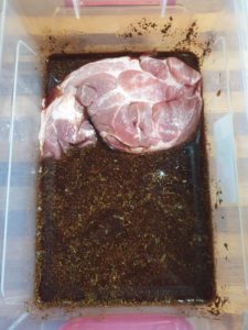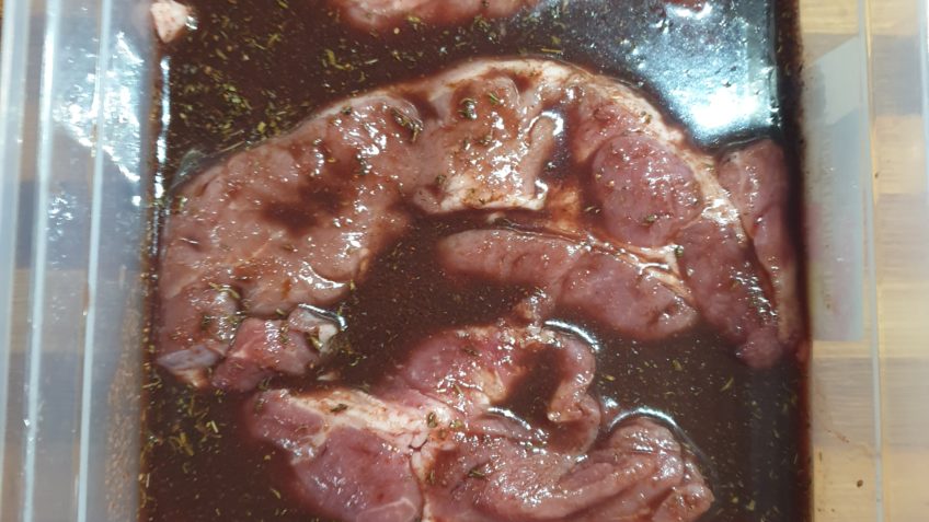 Pentru marinadă eu am folosit vin roșu (Fetească Neagră) dar dacă nu vreți să puneți vin, puteți pune apă cu oțet. Vă uitați la proporție în rețeta mea de coaste la cuptor. Dar, cu vin roșu au ieșit minunat. Marinada am pregătit-o seara, într-o caserolă cu capac, am pus ceafa și am lăsat-o la frigider. Cât? Până a doua zi la prânz. adica vreo 16 ore. Condimente am pus ce aveam prin casă și ce m-am găndit că și voi aveți. Nimic deosebit, deși aveam și variante mai deosebite. Voi le puteți schimba daca ceva nu vă place.