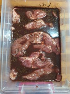 Pentru început, cu o seară înainte de a găti ceafa de porc, am pregătit o marinadă în care am lăsat să stea bucățile de carne în frigider, peste noapte.  Așadar, într-o caserolă dreptunghiulară cu capac am pus vinul, apa și restul componentelor ( sare, usturoi pudră, ghimbir pudră, boia de ardei, sos de soia, crema de oțet balsamic, zahăr, cimbru), amestecăm bine componentele și punem bucățile de carne.  Imaginea 1