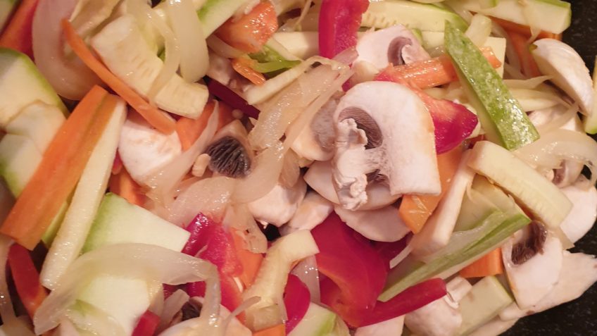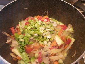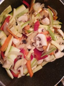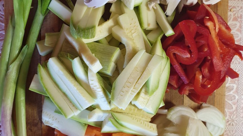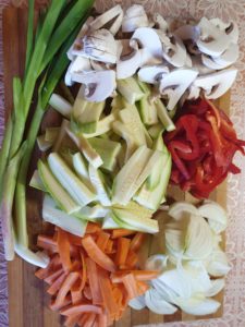 Cât timp s-a gătit carnea, am pregătit alături și niște legume sotate. Au ieșit tare bune. Pentru început am curățat toate legumele și le-am tăiat în bucăți mai mari (cu excepția usturoiului verde). Imaginea 6