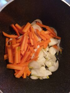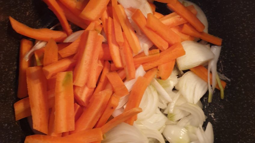 Într-o cratiță am pus ulei la încins și am adăugat pentru început ceapa și morcovul. Le sotăm pentru circa 5 minute. Imaginea 7