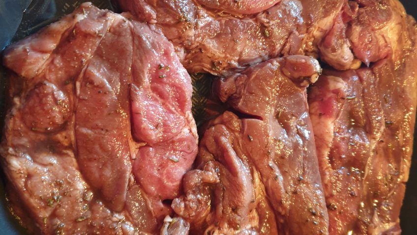A doua zi, într-o tigaie cu puțin ulei, punem la foc mediu bucățile de carne scoase din marinadă, acoperim tigaia cu un capac și lăsăm să se gătească pentru 20-25 minute (până ce ceafa este bine făcută). Imaginea 3