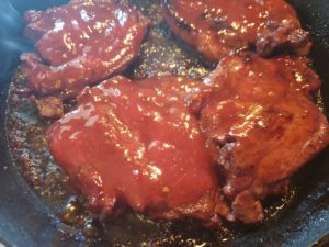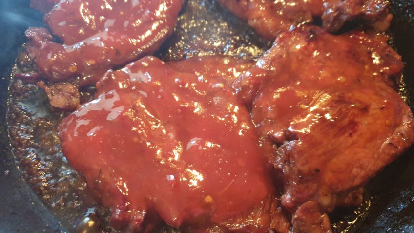 Ceafă de porc fragedă, cu sos lipicios făcută în tigaie