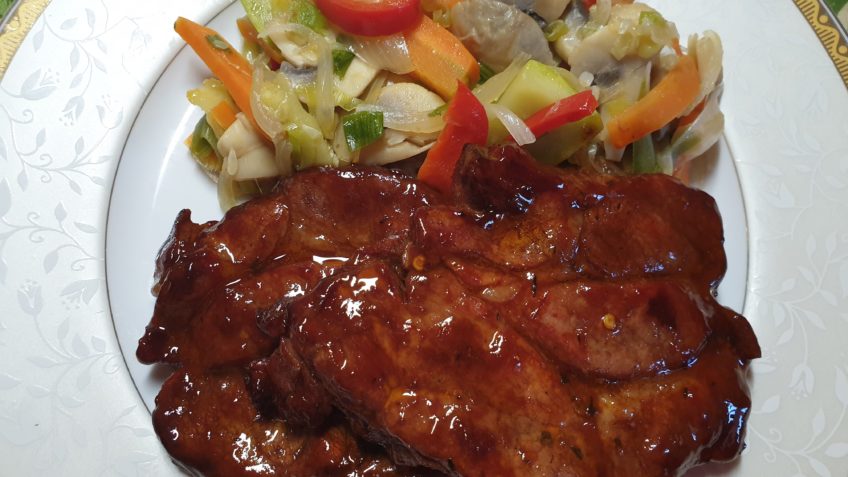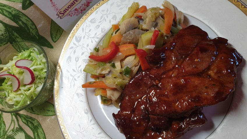 Ceafă de porc fragedă, cu sos lipicios făcută în tigaie, alături de un buchet multicolor de legume sotate, am gătit azi. Eram cu gândul la niște coaste de porc la cuptor, fragede și lipicioase. Dar cum nu am găsit coaste, am zis că improvizez ceva. Am cumpărat ceafă de porc, am marinat-o și am gătit-o la tigaie. De ce la tigaie? Pentru că este mai rapid și nu voiam să deschid cuptorul pentru patru felii de ceafă. S-a dovedit a fi o idee bună, au ieșit exact cum îmi doream.