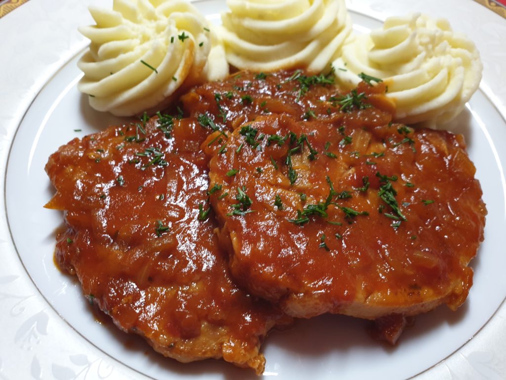 Cotlet fraged în sos de roșii cu ceapă și usturoi