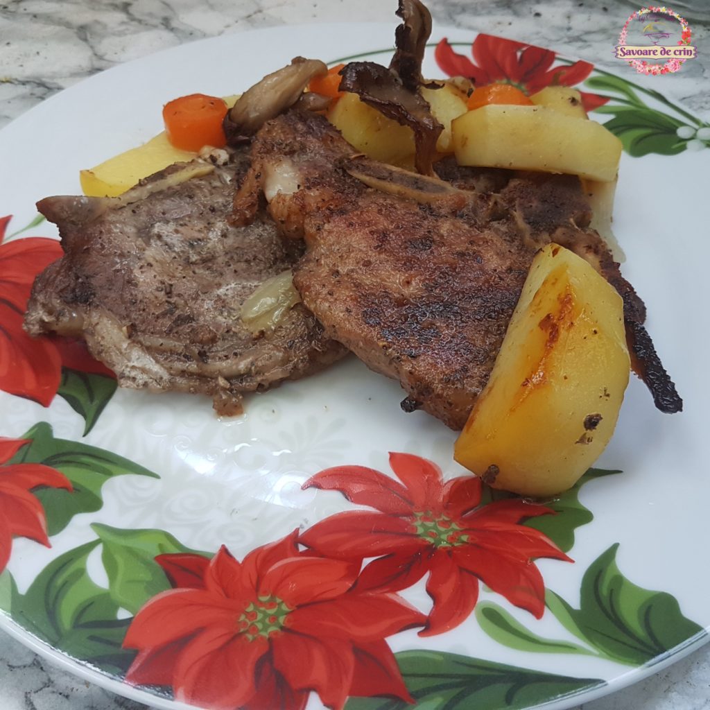 Cotlete de porc marinate, făcute la cuptor în bere, cu legume