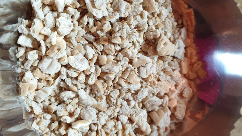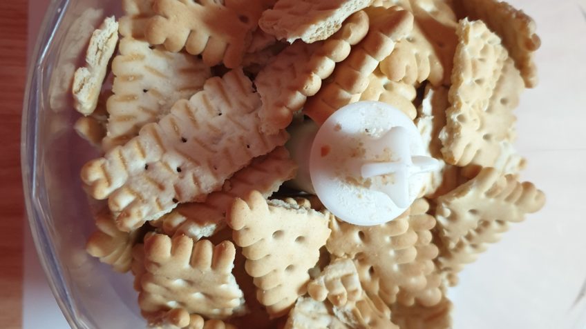 Mărunțim biscuiți dar nu până devin praf. Lăsăm bucatele potrivite ca mărime. Imaginea 2