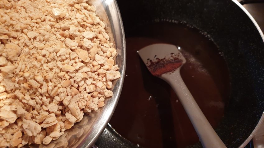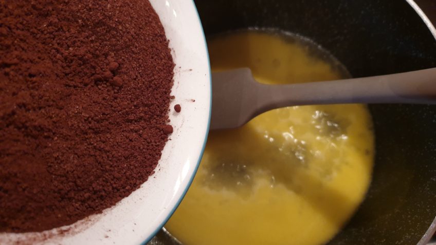 După ce untul s-a topit, adăugăm zahărul amestecat cu cacaoa . Amestecăm până la topirea completă a zaharului. Imaginea 5