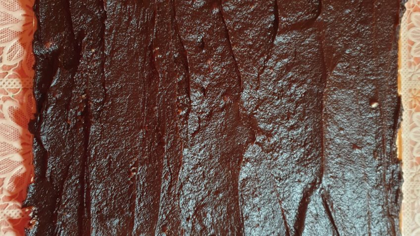 Începem să asamblam rulada. Punem crema de cacao cu rom și o intindem uniform pe foaia de napolitana. Imaginea 10