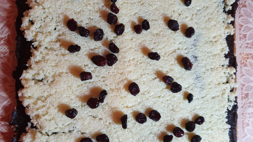 Adăugăm umplutura de cocos, o intindem cat de uniform putem, apoi presaram merisoare pe care le presam putin cu mâna. Imaginea 11