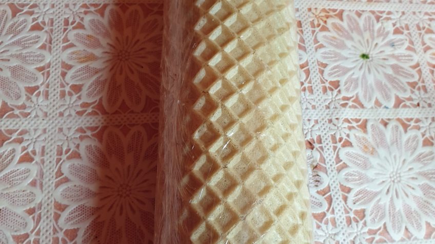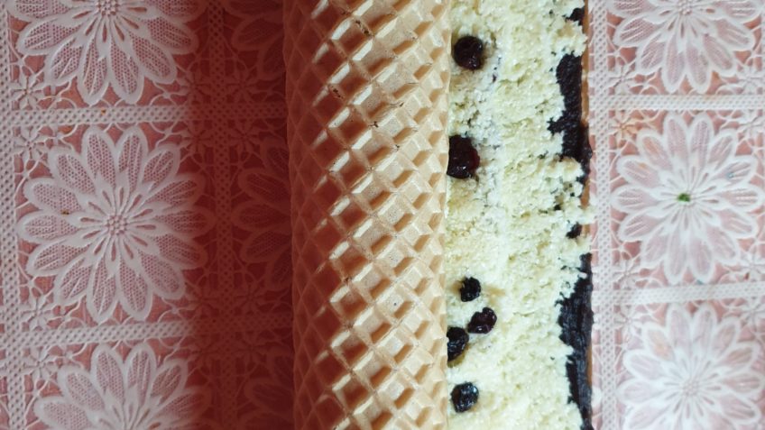 După cum știți, foaia de napolitana este tare, casantă. Astfel, pentru a fi rulată frumos eu am pus prima cremă călduță, am repartizat-o uniform si am asteptat careva minute. Din când în când trebuie verificat dacă foaia incepe sa se înmoaie, sa poată fi rulată. Nu trebuie lăsată foarte mult! Trebuie să pocneasca ușor în timpul rulării dar fără să se rupă. Astfel vom obține o ruladă perfectă iar napolitana își va menține textura. Va trebuie puțină îndemânare și putin exercițiu.