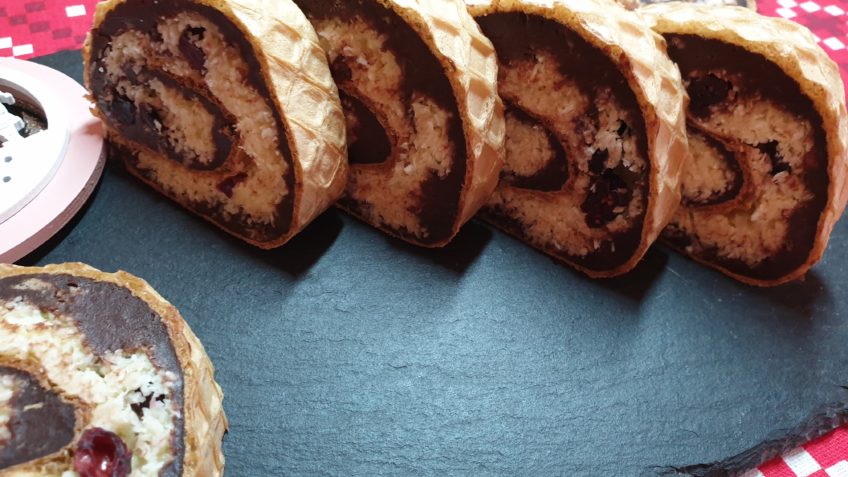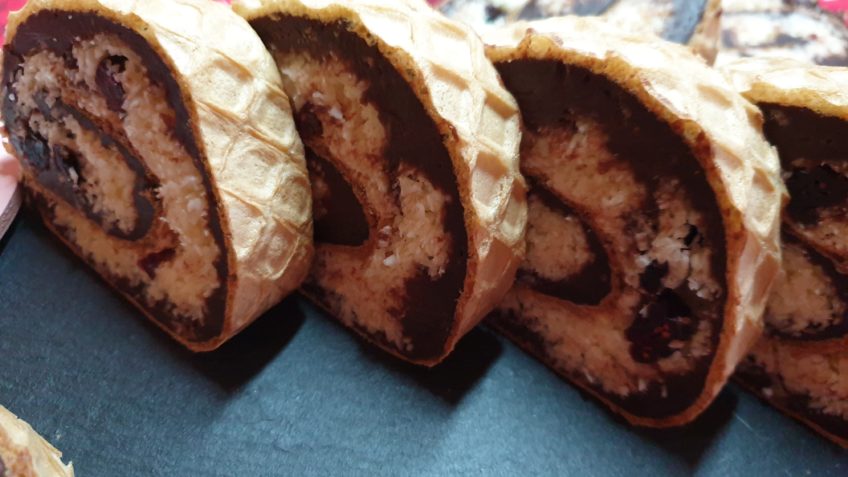 Ruladă in foaie de napolitană cu cacao, lapte condensat și cocos