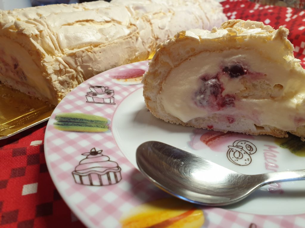Ruladă pufoasă din albușuri cu cremă de vanilie și fructe